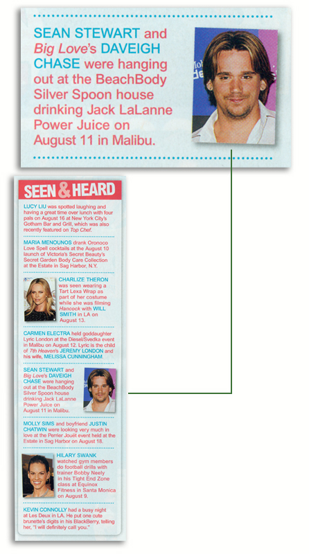 09.07 : InTouch Magazine - "Sean Stewart and Daveigh Chase              Drinking Jack LaLanne Power Juice on August 11 in Malibu"