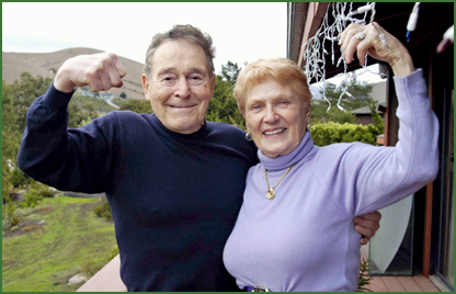 Jack La Lanne strikes his legendary muscle man pose along with his wife