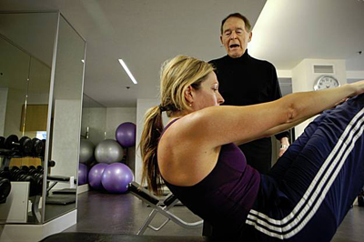 Jack LaLanne, 95, guides reporter Carolyne Zinko through a mini-workout.